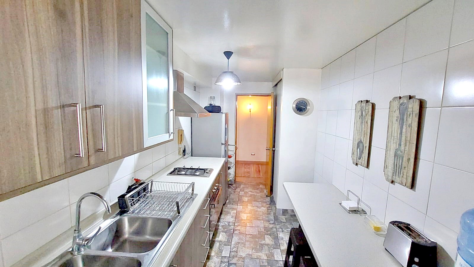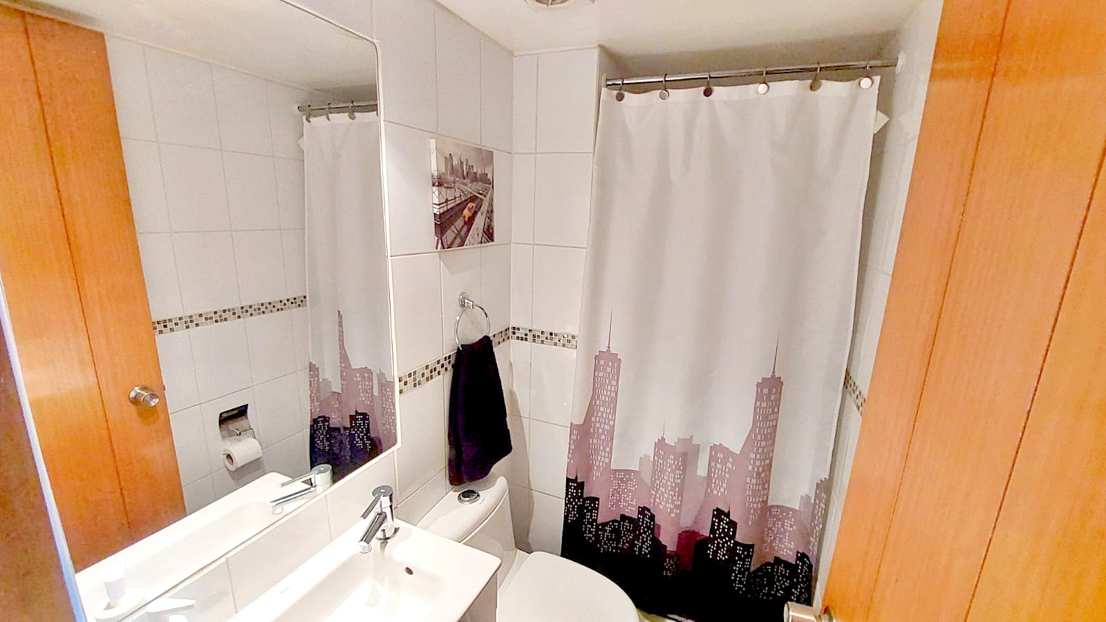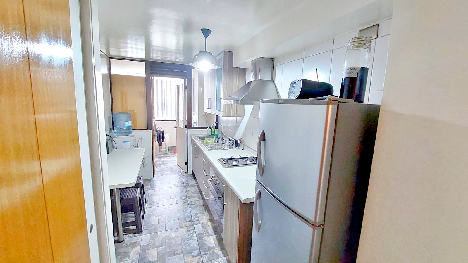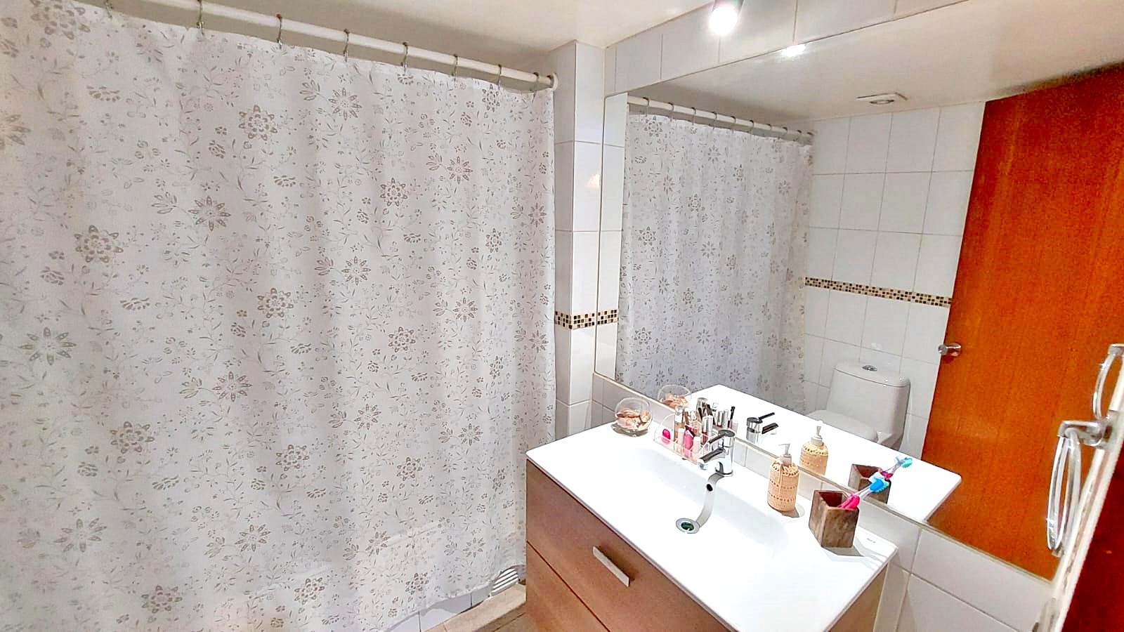 El área total del departamento es de 110 metros cuadrados, con 98 metros cuadrados de espacio útil. La distribución del departamento incluye un hall de entrada, un living-comedor con terraza, una cocina cerrada y equipada con una placa encimera de gas de 4 platos, campana y horno empotrado, así como una logia amplia con un termo eléctrico de gran capacidad. El dormitorio principal cuenta con baño en suite, walk-in closet y baño remodelado. El segundo dormitorio tiene un closet y un baño completo en el pasillo, que puede servir como baño de visitas. El departamento tiene piso de cerámica en todas las áreas comunes, excepto en los dormitorios, que cuentan con piso flotante. La calefacción es exclusivamente eléctrica.