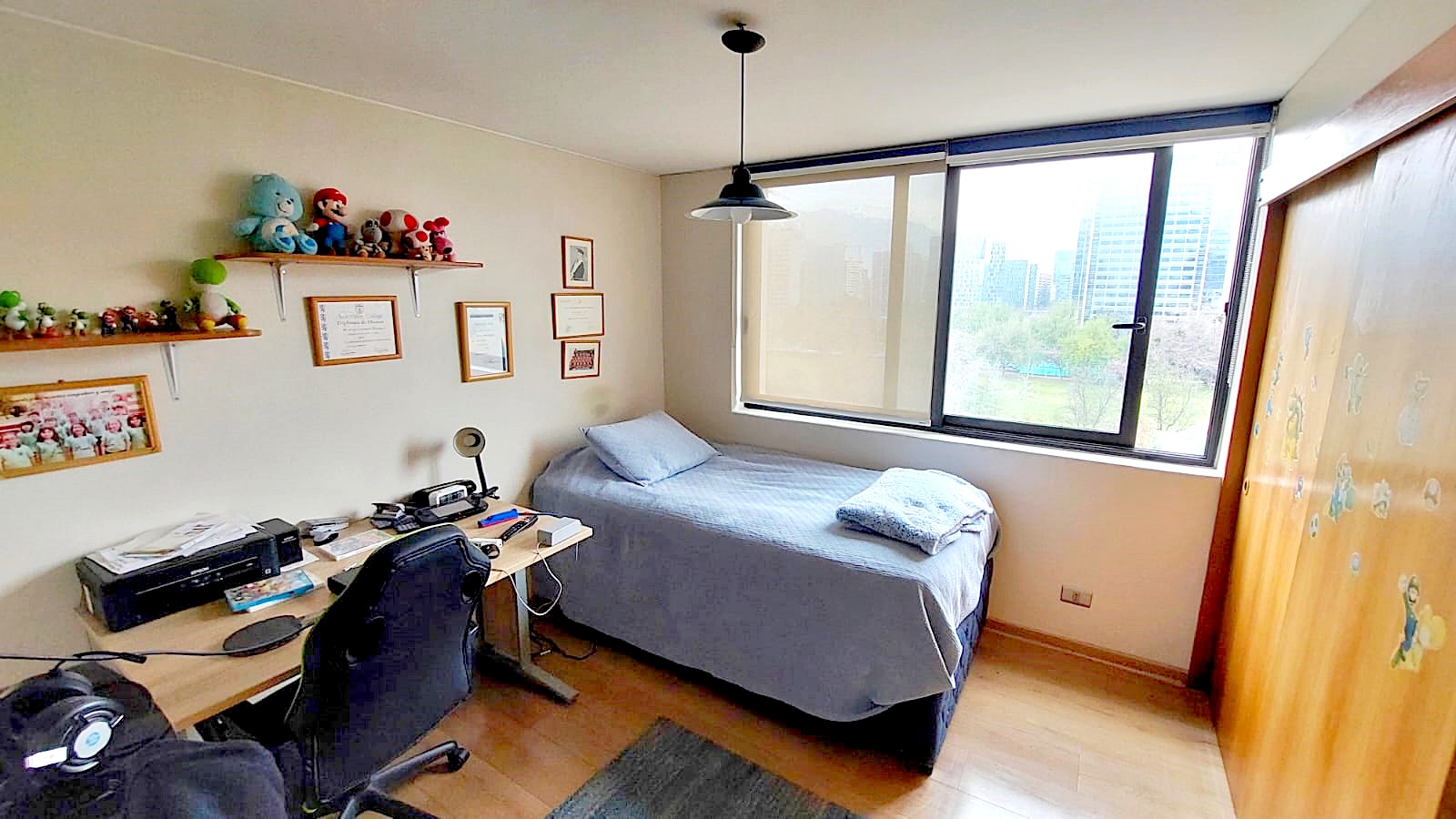 Este departamento se encuentra en excelentes condiciones de conservación y es amplio y luminoso, con una vista directa al Parque Araucano. Además, ofrece fácil acceso a diversas comodidades, como el Mall Parque Arauco, supermercados, Home Center, Ikea, bancos y una excelente conectividad. También se encuentra a solo 10 minutos a pie de la estación de metro Manquehue y de la futura estación de la línea 7 del metro, lo que aumentará el valor del sector.