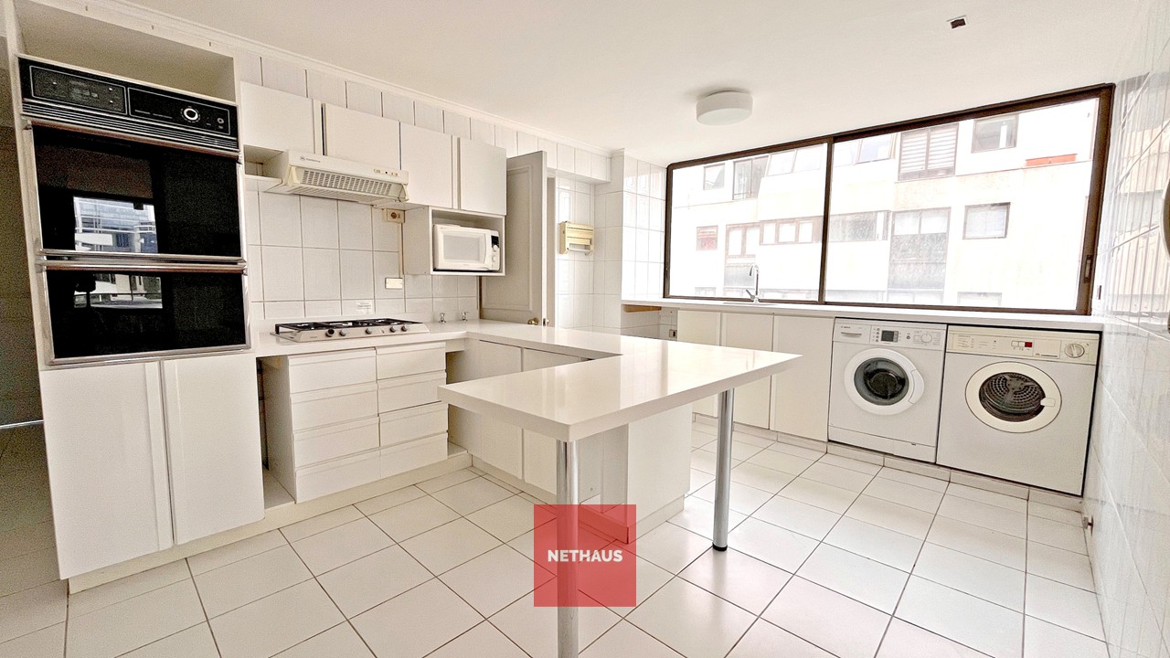 La cocina está completamente equipada e incluye horno empotrado, encimera, comedor de diario, conexión para lavavajillas y un práctico shaft de basura, que facilita las tareas de limpieza. La logia se encuentra incorporada, optimizando el uso del espacio.